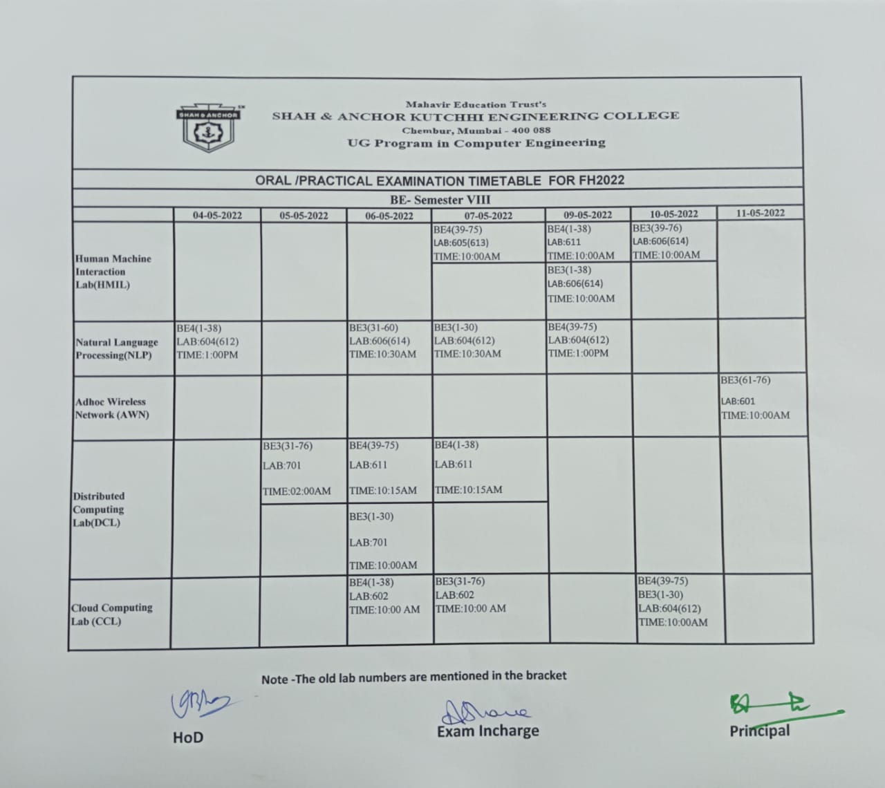 Viva Time Table For B.E. FH2022