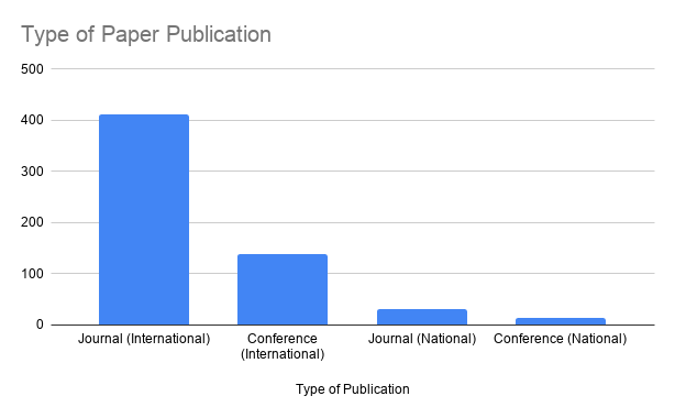 The segregation of papers published in which type of journals and conference, we can see most of the papers and articles are published in International Journals.