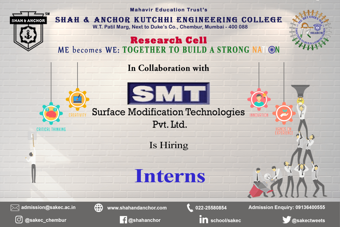 SAKEC Research Cell, in collaboration with Surface Modification Technologies Pvt. Ltd., is looking to recruit student interns to provide solutions to their automation process using state-of-the-art technology.